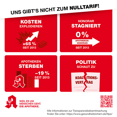 Mit dieser Aktion machen Apotheken bundesweit darauf aufmerksam, dass steigende Kosten, zunehmende Bürokratie und unveränderte Honorare die Arbeit der Apotheken immer schwieriger machen. Wir setzen uns dafür ein, dass die Arzneimittelversorgung durch Apotheken vor Ort langfristig gesichert bleibt.